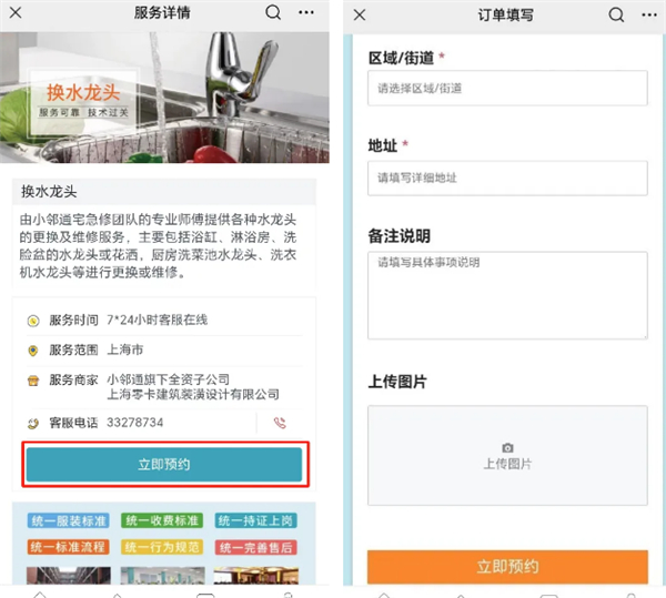 2. 在服务详情页面,点击“立即预约”按钮,然后填写订单的详细信息。