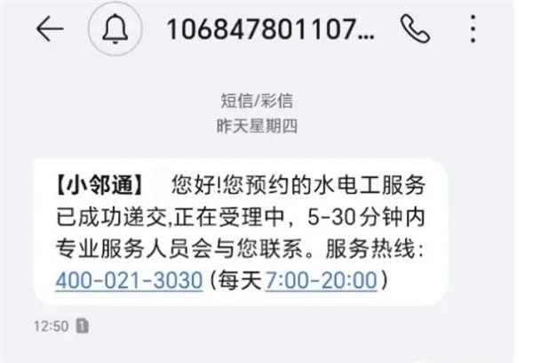 3、订单预约成功后,老同志会收到短信,小邻通的相关服务人员会主动通过电话与老同志取得联系,进而确定上门服务的时间。