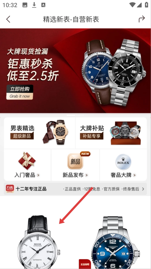 2. 在“精选新表 - 自营新表”页面,点击【目标手表】,即可进入商品详情页面。