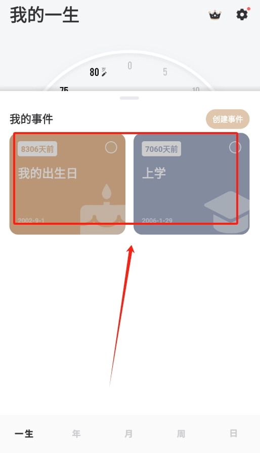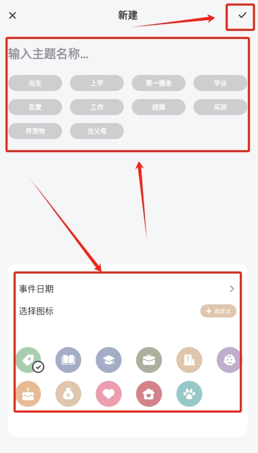 2、先挑选事件类型以及与之对应的图标,填好事件时间,接着点击右上角的勾号进行保存。