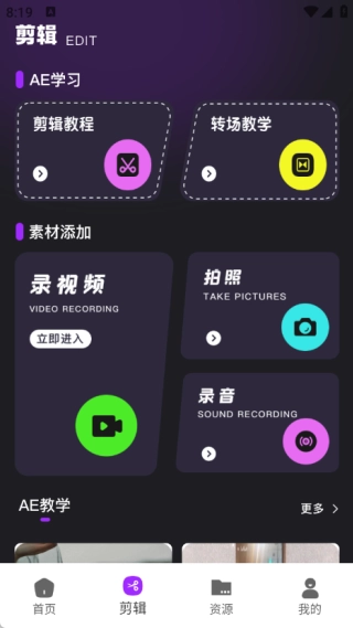 在剪辑界面里,划分了AE学习资源区、素材导入功能区以及AE教学内容区等多个不同的功能板块。