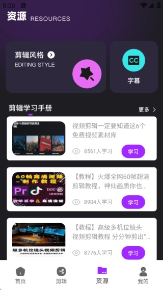 资源页面里能了解到不同的剪辑风格,也有字幕相关内容,另外还包含剪辑学习手册。