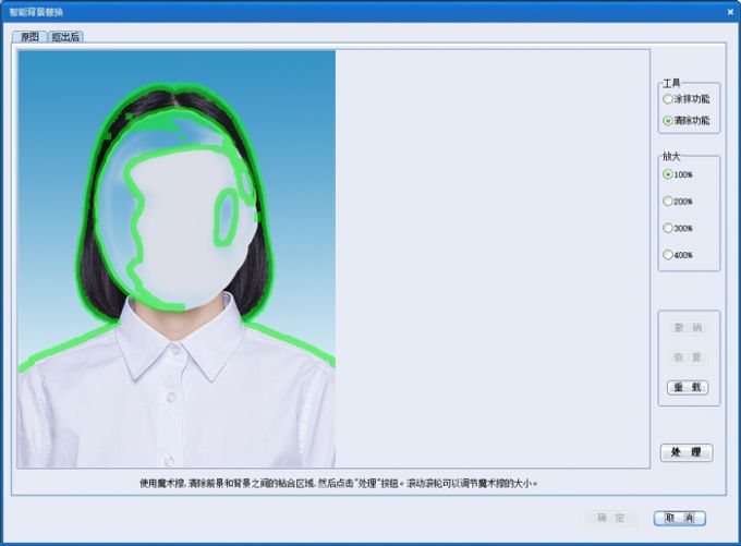 然后如图2所示,在替换背景前勾选“清除功能”并将数值放大至“100”,这样能更清晰地区分背景与前景,对替换背景更有帮助,最后点击“处理”按钮即可。