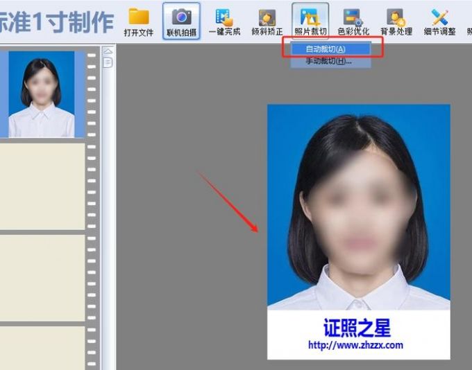 如图4所示,当选择“标准一寸制作”规格时,点击页面上方的“照片裁切”功能,然后选择“自动裁切”选项。