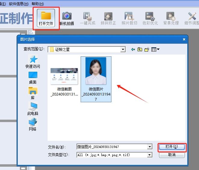 如图1所示,启动证照之星软件后,点击界面上方的“打开文件”按钮,在弹出的文件选择窗口中选定待修改的证件照,接着点击“打开”选项,即可将证件照原始文件导入到软件中。