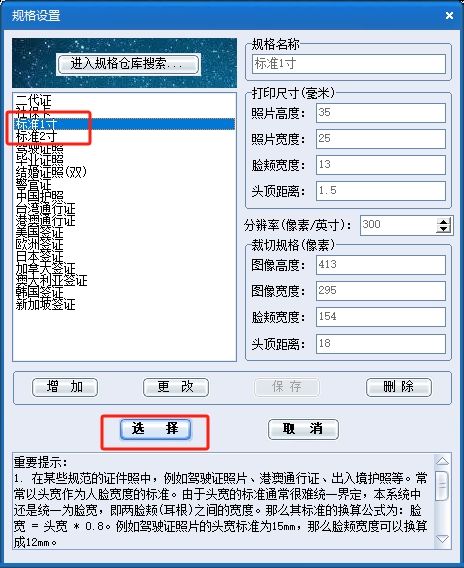 然后在规格设置框里勾选“标准一寸”格式,再点击“选择”按钮。