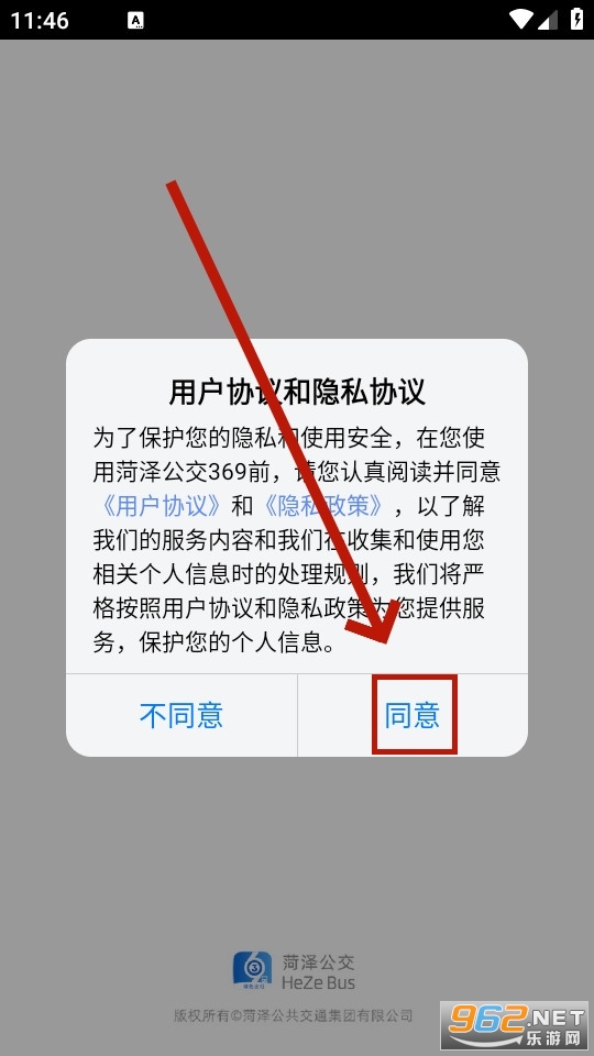 先安装“菏泽公交369”应用,安装完成后打开它。进入应用时,找到并点击“同意”按钮,以此确认同意该应用的隐私协议。