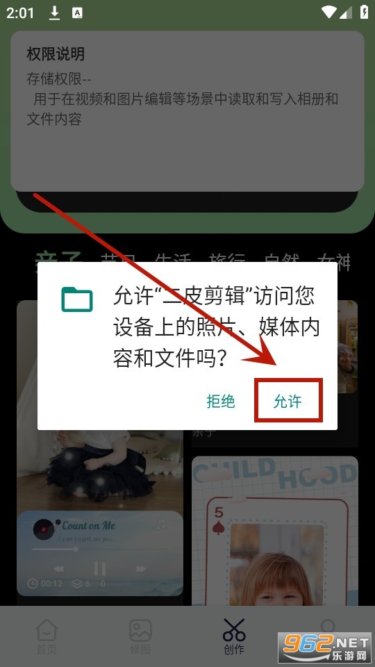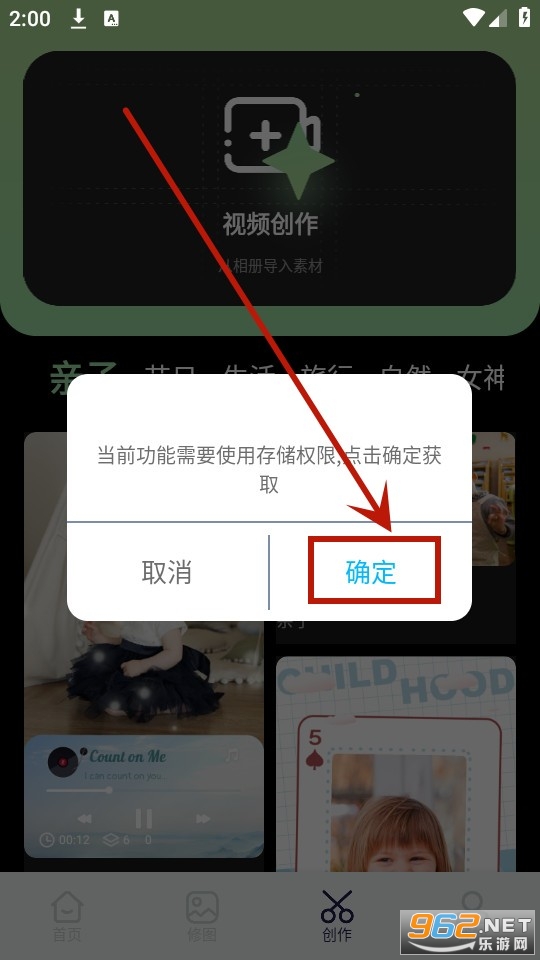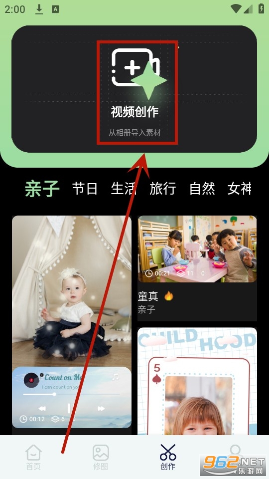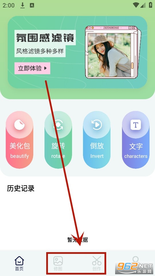进入首页后,可根据自身需求选择相应功能:若需修图,点击“修图”选项;若需剪辑视频,则点击“创作”选项。