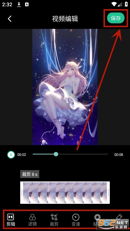 你可以按照下方的功能提示来剪辑视频,完成后点击【保存】按钮,视频就会自动保存到手机相册里了。