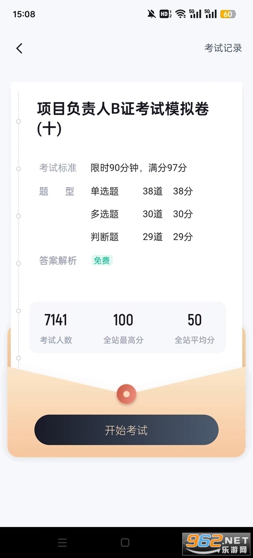 在点击开始考试后,就能查看该模拟卷题库的详细说明,其中涵盖考试标准、提醒以及解析等内容。