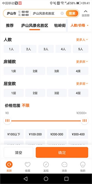 确定好具体位置后,用户接下来就可以选择房源类型了。可以点击页面右侧的【人数/价格】,在弹出的下拉页面中对人数、床铺数、居室数、价格范围等条件进行精确筛选。