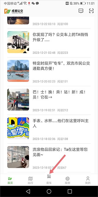 用户打开登录应用后进入首页,点击底部中间位置的【乘车】按钮(即下图中红色箭头所指向的按钮)。
