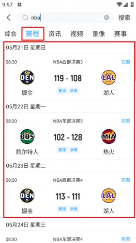 搜索后进入赛程页面,就能查看近期所有NBA比赛的赛程安排。