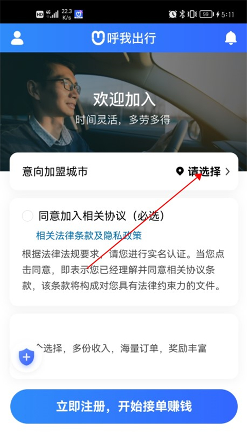 在本站安装并打开呼我司机极速版应用,进入软件首页后,点击“意向加入城市”选项。