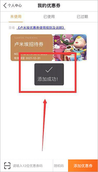 扫描完成后,点击【添加优惠券】选项,就能把电影券兑换到账户里了。