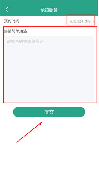 进入【预约服务】页面,填写【预约时间】和病情的简要说明,然后点击提交按钮。