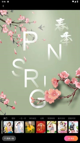 先挑选好合适的人像图片素材,再导入模板来制作全新内容,最后进行在线预览。