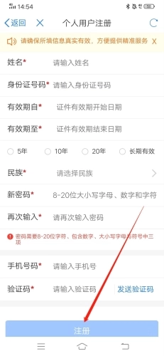 把相关的个人信息全部填写进去,接着输入手机号码获取验证码并填写,点击下方的【注册】按钮,如此我们就可以帮他人注册账号了。
