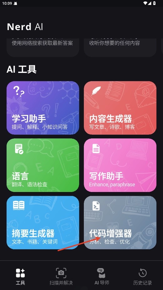 点击代码增强器,输入代码后,Nerd AI会给出详细的解释内容,助力您掌握编程逻辑,还能对代码进行检查与优化。