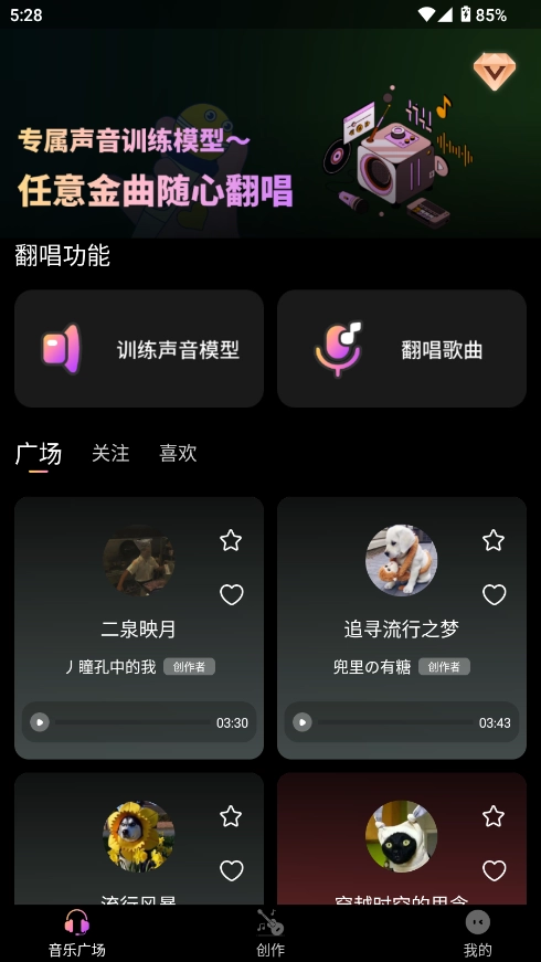发行个人专属原创歌曲:在音乐广场聆听他人新作,发布自己的最佳创作。