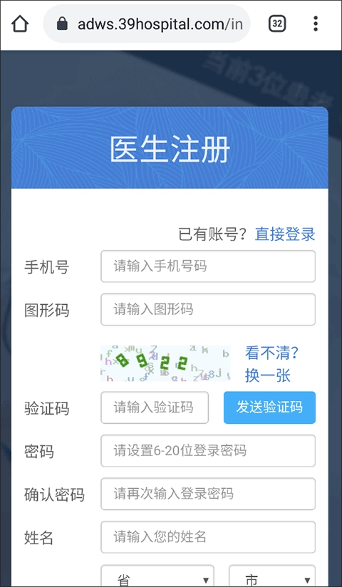 然后,跳转到网页后,依次填写手机号、图形码、验证码、密码、确认密码、姓名、所在医院、科室及职称,再勾选“我已阅读用户协议”即可。
