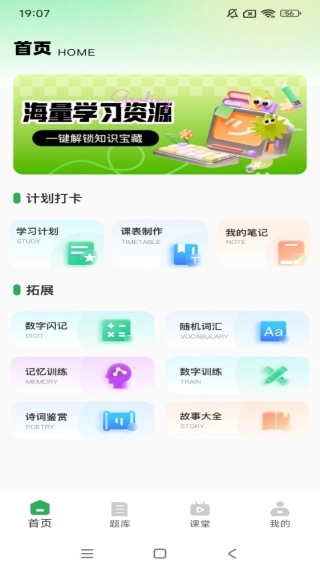 首页的学习资源十分丰富,涵盖随机词汇学习、数字认知训练以及记忆强化教学等多种内容。