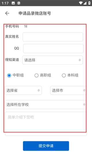 进入【申请品录微店账号】的界面后,要填写【手机号码】【真实姓名】这类信息,选择对应的组别和地区,填写完毕后点击【提交申请】按钮。