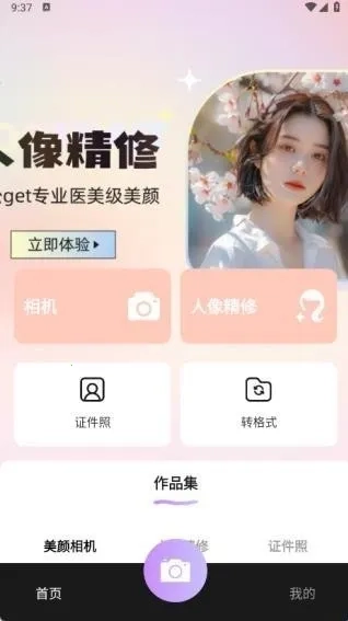 首页设有相机、人像精修、证件照制作、格式转换等功能入口,还可以浏览查看作品集。