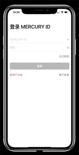 安装水星安防应用,启动MERCURY安防程序,输入MERCURY ID的账号与密码后点击登录按钮。若您尚未拥有MERCURY ID,可点击新用户注册选项,依据页面提示完成MERCURY ID的注册流程,具体操作步骤可参考下图: