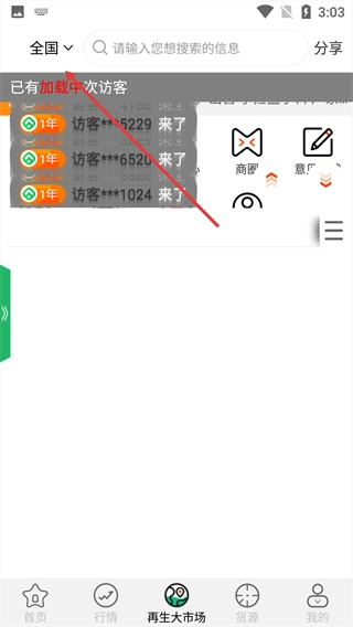 在再生大市场页面,点击左上角的“全国”地区选择按钮,进入地区选择界面。