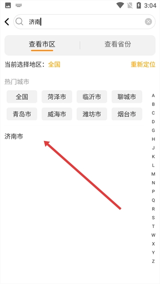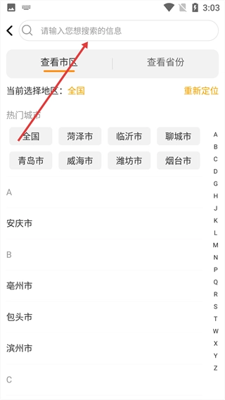 在地区选择页面,点击顶部的搜索框,输入想要查找的城市名称。