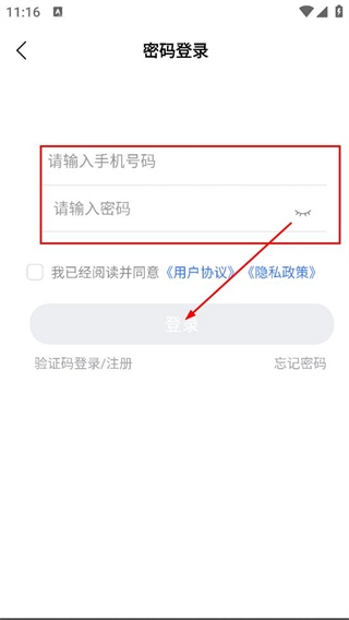 在密码登录页面,输入手机号与密码后点击登录按钮,即可完成账号的登录操作。
