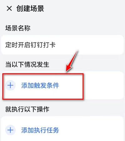 首先在“场景名称”下方的输入框中输入文字,把要创建的智慧场景命名为“定时开启钉钉”。