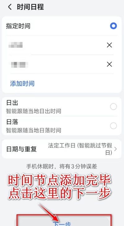 时间节点已添加完成,现在请点击下方的“下一步”,接着添加需要执行的任务——打开“钉钉”应用。