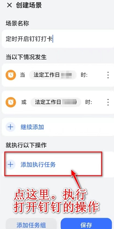 选好后回到下方界面,这便是智慧场景设置的主界面了。请在此仔细检查,确认设置无误后,记得点击下方的“保存”按钮,将你费心设置的“定时开启钉钉打卡”智慧场景添加到我的智慧场景列表中,让它开始运行吧。