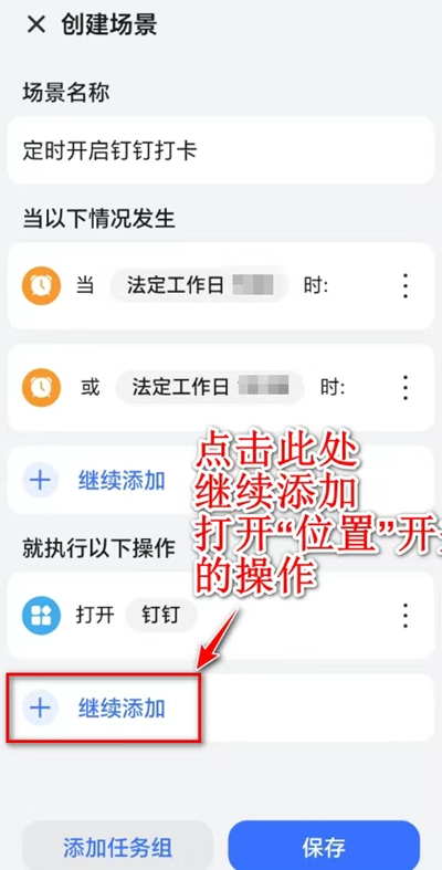 但这样还不够,流程尚未结束,还需要第四步操作:此时手机需自动开启“位置”权限,为钉钉提供位置信息,否则自动打卡会中断并失败。具体步骤是点击“就执行以下操作”下方的“继续添加”按钮,添加自动开启“位置”开关的操作。
