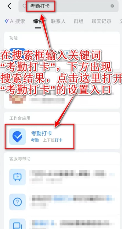 1, 找到钉钉考勤打卡的设置入口,这里给大家分享一个快捷操作的小技巧——“搜索是万能的钥匙”,只要遇到搜索框,直接输入关键词,就能通过搜索快速定位到所需的操作入口。具体可参考图示:
