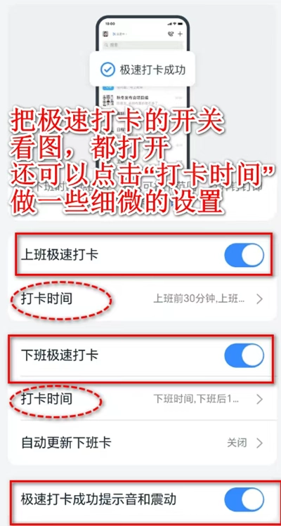 二、接着在“钉钉”中设置好极速打卡功能,就能实现“上班前和下班后自动打开‘钉钉’并完成考勤打卡”的自动化操作,是不是非常便利呢?其实完成这样的设置一点都不难,接下来请按照图示进行操作: