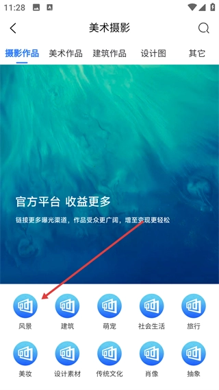 进入【美术摄影】分类页面后,点击【风景】等子分类标签,就能筛选出相应类型的摄影作品资源。