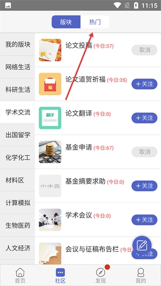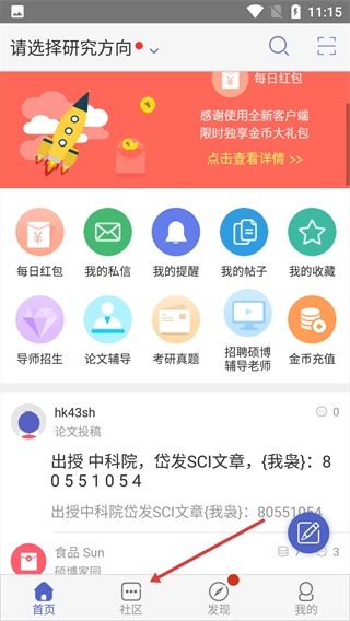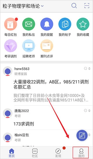 点击底部【社区】按钮,进入社区功能页面。