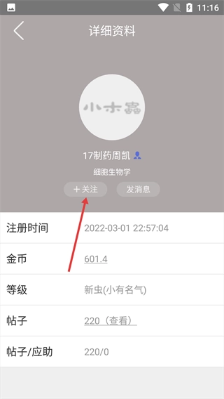 进入用户详情页后,点击【+关注】按钮,就能完成对该用户的关注。