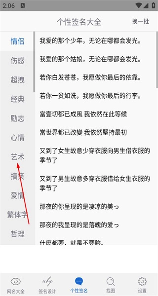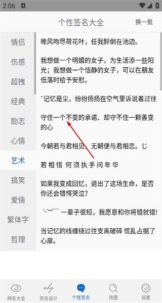 在个性签名大全页面,点击艺术分类,浏览该分类下的签名内容,挑选出自己喜欢的签名文本。