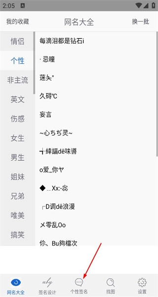 打开软件后,进入首页,浏览各类网名,点击个性签名选项,进入个性签名大全页面。