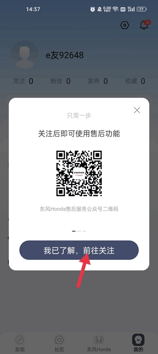 点击“允许”并进入微信,扫码关注东风Honda售后服务公众号,随后返回绑定微信页面,再次点击“允许”进入。