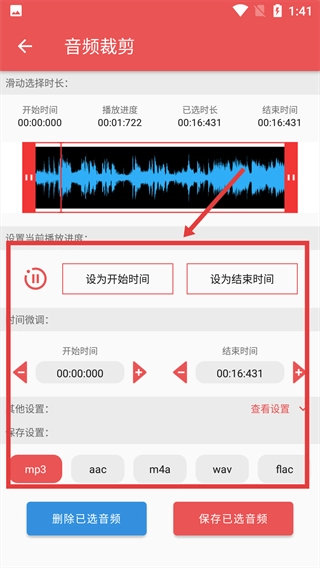 你可以通过滑动波形或点击按钮来设定音频裁剪的起始与结束时间,并且还能选择音频的保存格式。