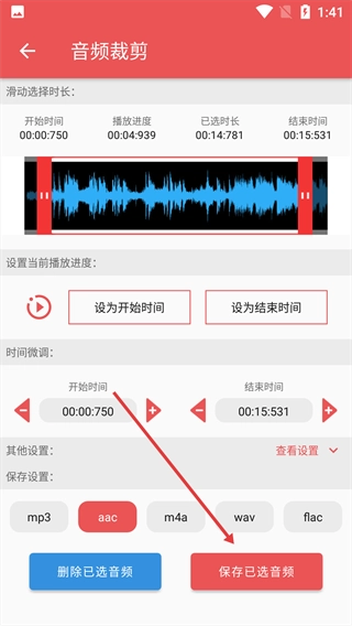 确认参数设置无误后,点击页面底部的【保存已选音频】按钮,即可完成本次音频裁剪的保存流程。