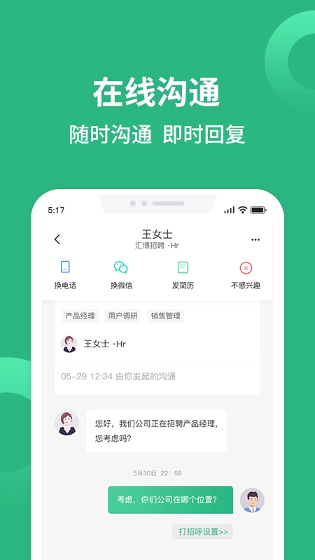 找工作的人能够精准定位到适合自己的公司,快速检索到相关的工作信息,并且可以随时随地与企业的人力资源部门开展在线沟通。