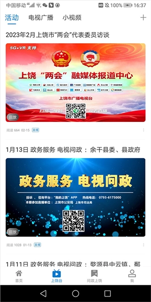 用户启动软件后,点击底部导航栏的【上饶台】选项,即可进入电视直播界面。在这个界面中,用户能够观看上饶当地正在进行的各类相关活动的直播内容。