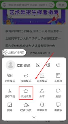 进入网页后,若想将其保存为书签,可点击手机的选项键,此时会弹出一个菜单,在菜单中点击收藏按钮,即可把该网址收藏到手机的收藏夹里。