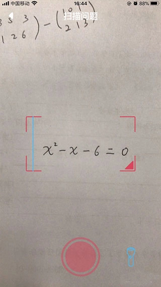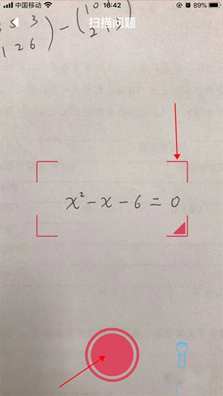 打开手机摄像头,把题目放到屏幕提示的区域里,接着点击下方的红色按钮;